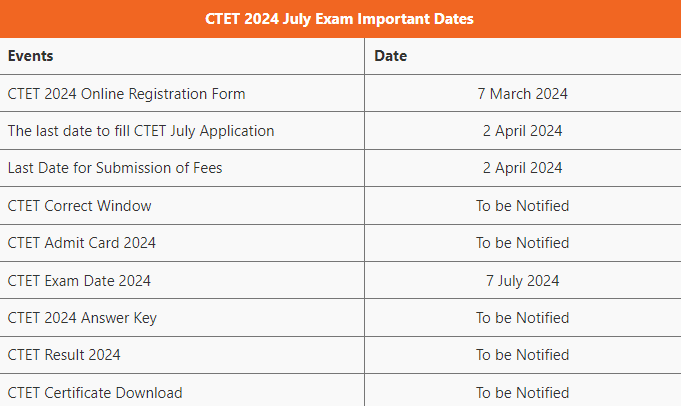 he Central Board of Secondary Education (CBSE) has released the CTET 2024 Notification on its official website. The CTET examination will be held on 7 July 2024 all over India. The CTET Application form has been started from 7 March 2024. The Last date to fill out the Application form will be scheduled on 2nd April 2024. Candidate must check the below article to learn more about the CTET 2024 Notification, Exam Date, Apply Online link, and Eligibility Criteria